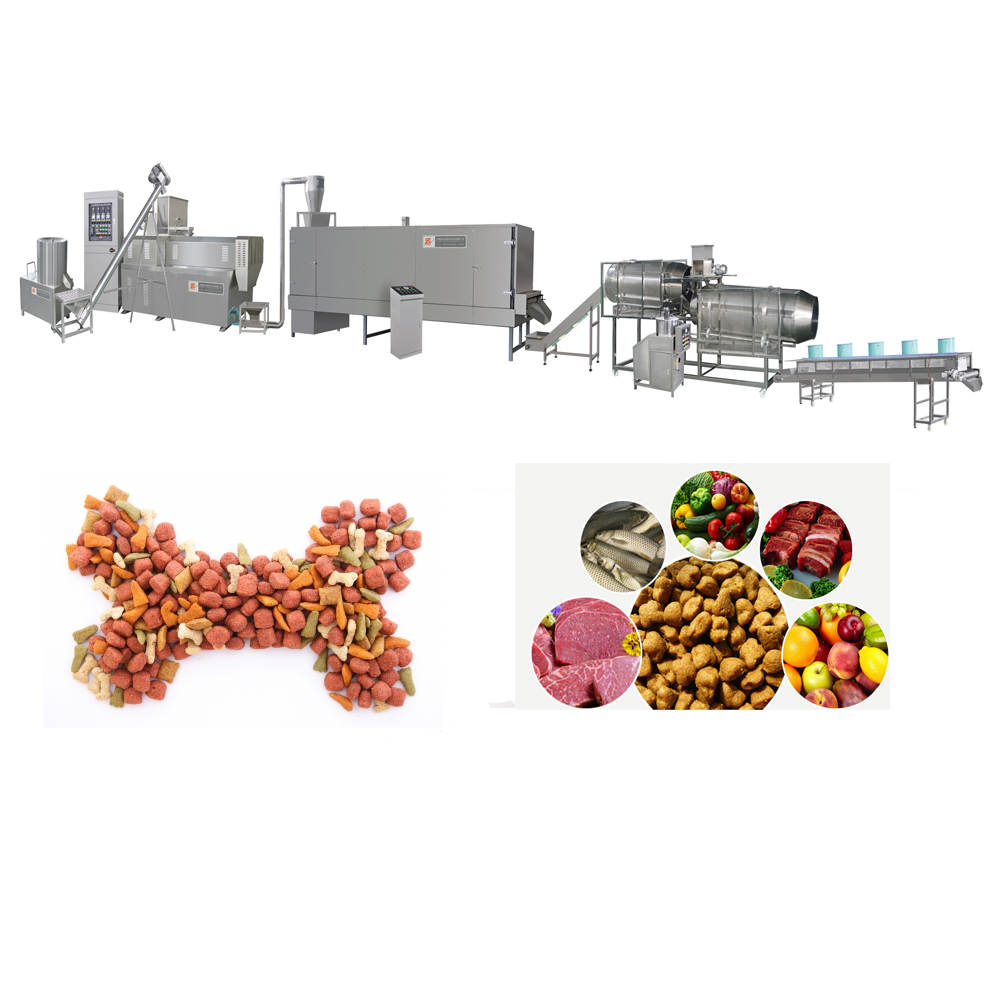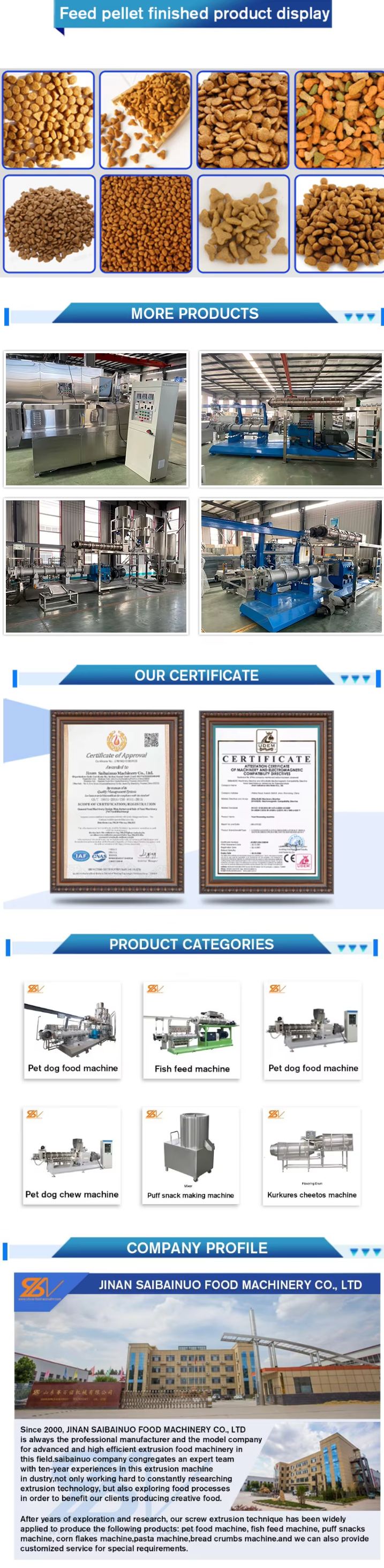 Jinan saibainuo company dog food machine are equipped with the latest process technology, the core of which is the extrusion system with the extruder and the process control system .In the production process, the raw materials undergo the process steps of weighing, fine grinding, mixing,extrusion, drying, vacuum coating,cooling and packaging.